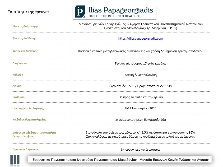 Η έρευνα πραγματοποιήθηκε από τη Μονάδα Ερευνών Κοινής Γνώμης και Αγοράς του Πανεπιστημίου Μακεδονίας για λογαριασμό του blog για επενδύσεις και ακίνητα του κ. Παπαγεωργιάδη. Τα ευρήματά της αναλύθηκαν επί σκηνής από τον επ. καθηγητή Γιώργο Σιάκα, διευθυντή της Μονάδας, τον δημοσιογράφο Παύλο Πανταζόπουλο και τον διοργανωτή. Το δείγμα της ήταν 1.500 άτομα με τηλεφωνικές συνεντεύξεις στους νομούς Αττικής και Θεσσαλονίκης.