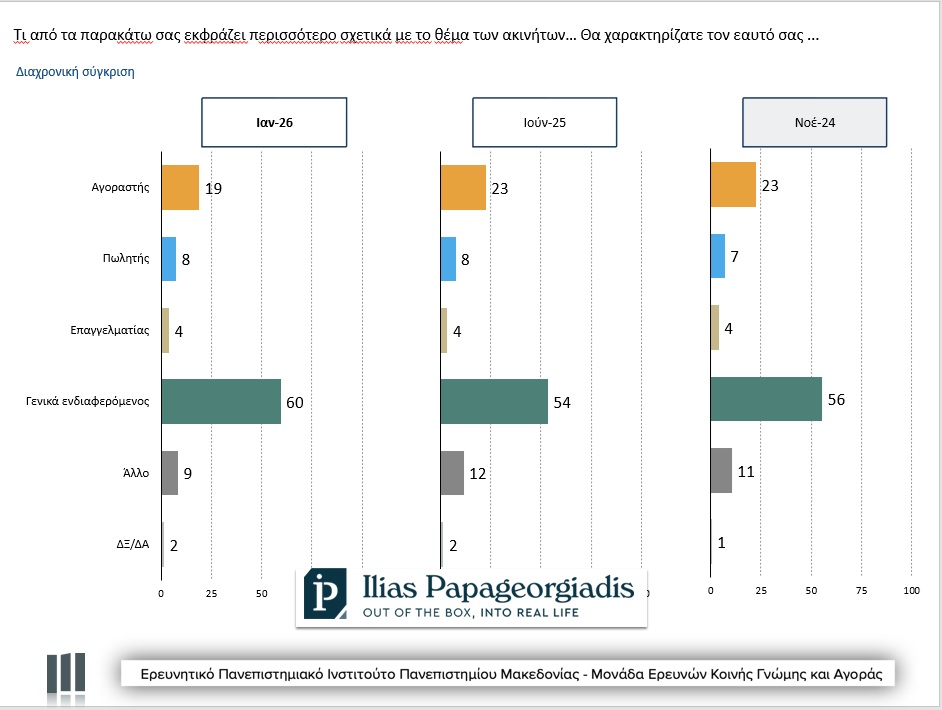 Την ίδια ώρα το ποσοστό όσων θέλουν να αγοράσουν σπίτι «άμεσα, εντός εξαμήνου ή εντός του χρόνου» υποχώρησε από το 34% (Νοέμβριος 2024) στο 23% σήμερα. Στην πράξη λοιπόν μόλις το… 4,37%* των ερωτώμενων δηλώνουν αγοραστές που θέλουν να αγοράσουν ακίνητο εντός 12μήνου.