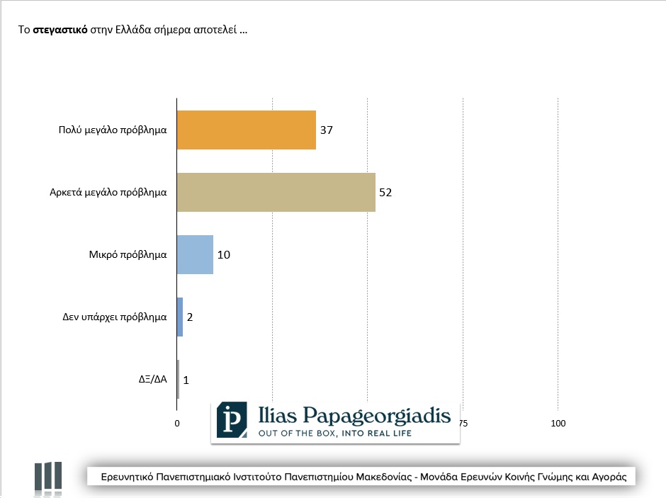 Το 89% των πολιτών θεωρεί το Στεγαστικό πρόβλημα ως «αρκετά μεγάλο / πολύ μεγάλο πρόβλημα», ενώ ένα ακόμη 10% το θεωρεί «μικρό πρόβλημα». Αυτά τα αποτελέσματα παραμένουν σταθερά σε όλα τα «Βαρόμετρα» και καταδεικνύουν την ένταση του προβλήματος. (Υπάρχει και 1% που μάλλον είναι… εξωγήινοι…)