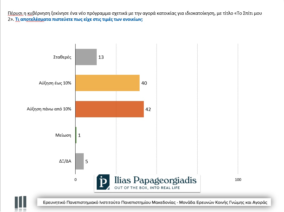 Στην ερώτηση για τις επιπτώσεις του προγράμματος αυτού στα ενοίκια των κατοικιών, το 82% εκτίμησε ότι οδήγησαν σε άνοδο ως 10% ή πάνω από 10%, με το 13% να δηλώνει πως οι τιμές έμειναν σταθερές και το 1% να λέει πως αυτές μειώθηκαν. (Στην ομάδα αυτών που δηλώνουν αγοραστές και αναζητούν κατοικία το ποσοστό αυτό φτάνει το 87%).